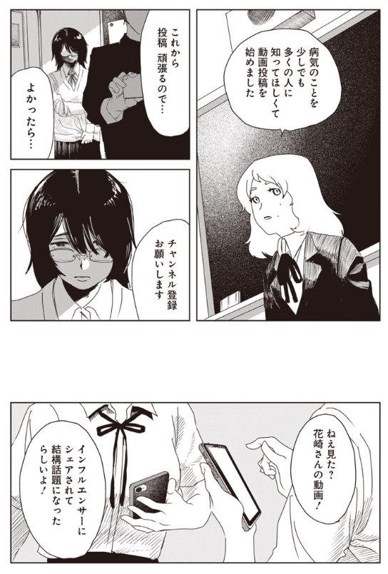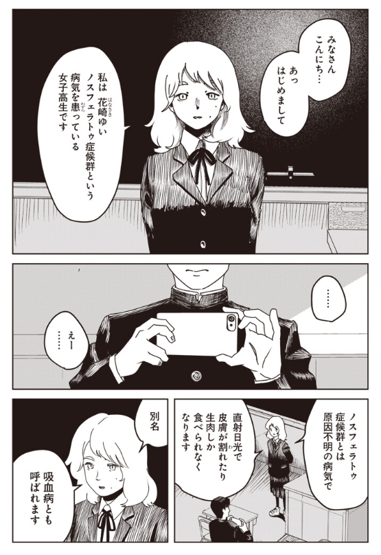 「日陰のふたり」は高校生たちの関係性を描いた物語。ノスフェラトゥ症候群(別名:吸血病)という原因不明の病気で日光に当たることができず生肉しか食べられない花崎は、周囲に誘われたことをきっかけに動画投稿を始めることに。