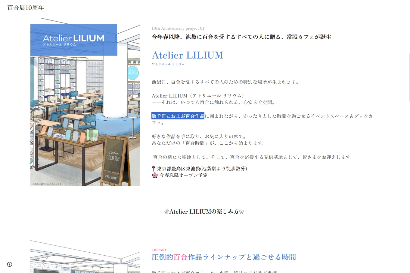 新たに発表された情報として2026年春ごろより東京・池袋にて百合がテーマの常設カフェ『Atelier LILIUM(アトリエール リリウム)』のオープンが発表されました。数千冊におよぶ百合作品が用意されている他、イベントスペースなどが用意されているとの事です。