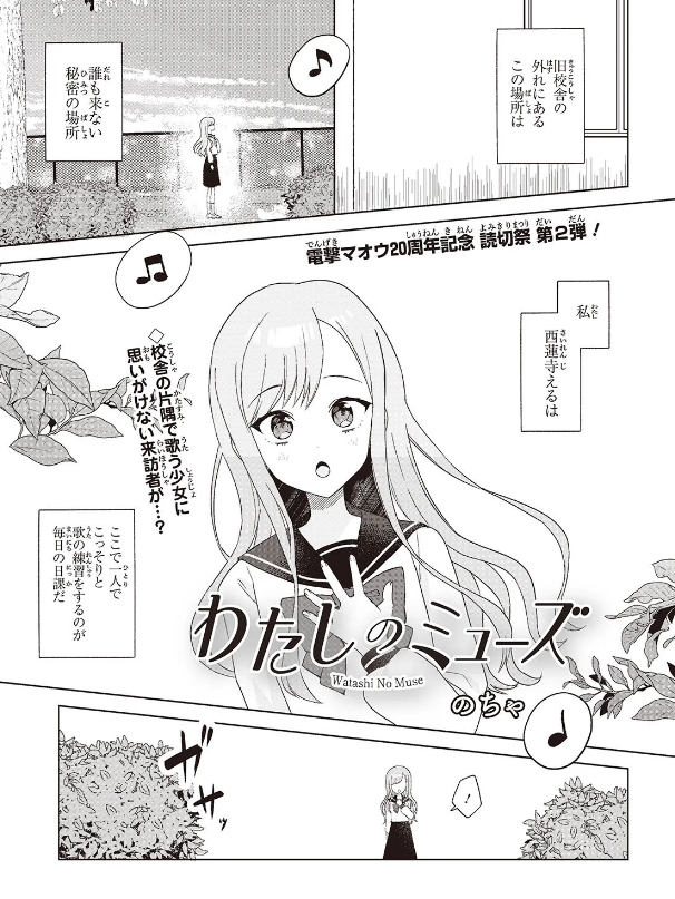 「わたしのミューズ」は歌で紡がれた学園ガール・ミーツ・ガールを描いた物語。引っ込み思案の少女・西連寺えるは、旧校舎の外れにある秘密の場所でこっそりと歌の練習をすることが毎日の日課だった。
